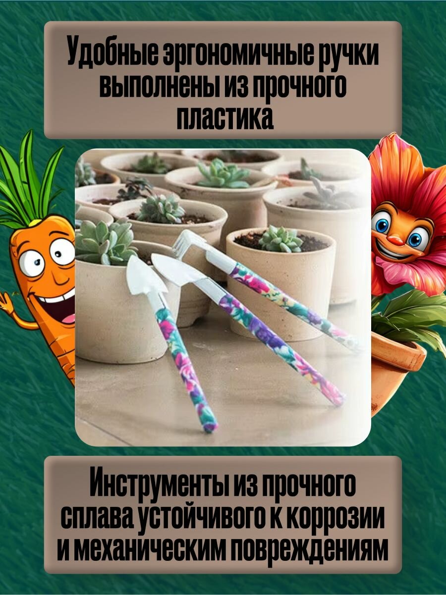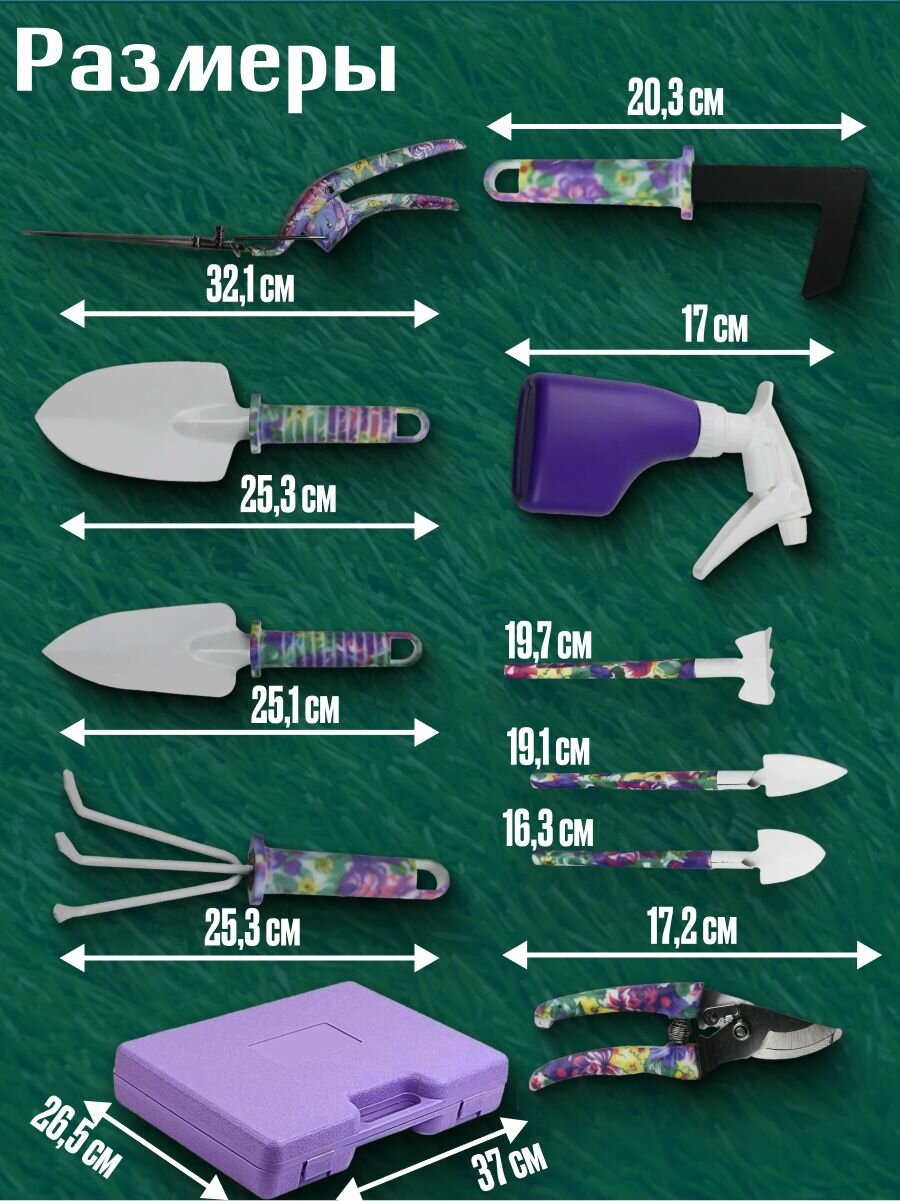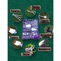 Комплектация: 3 инструмента для ухода за растениями в горшке, 1 шт. опрыскиватель, 1 шт. секатор, 1 шт. большая лопата, 1 шт. маленькая лопата, 1 шт. лопата для мха, 1 шт. ножницы для прополки и 1 шт. грабли, кейс.