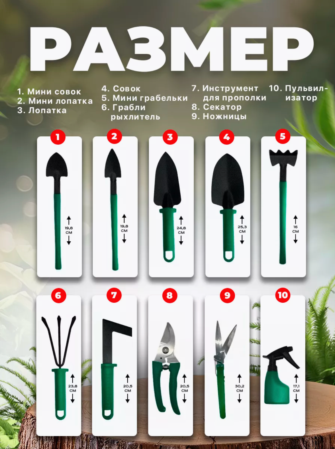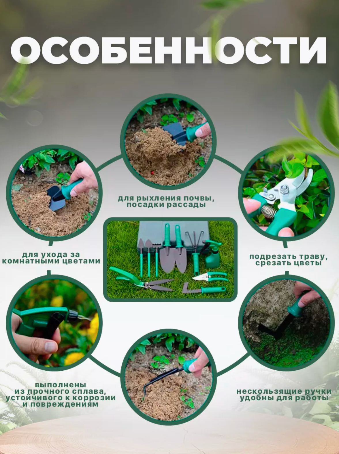 В набор входят различные виды лопаток, грабель, секаторов и других инструментов, которые помогут вам справиться с любыми задачами в саду.