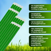 Опора для растений изготовлена из стальной трубы 10 мм и покрыта ПВХ оболочкой для защиты от коррозии. Набор металлических садовых колышков упакован в пакет для удобной транспортировки на дачу без автомобиля.