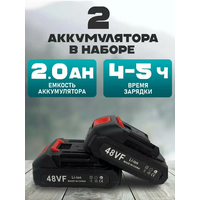 Емкость аккумуляторов составляет 2 Ач, что обеспечивает продолжительное время работы. В комплекте идут два аккумулятора, что позволяет не прерываться на зарядку и продолжать работу.