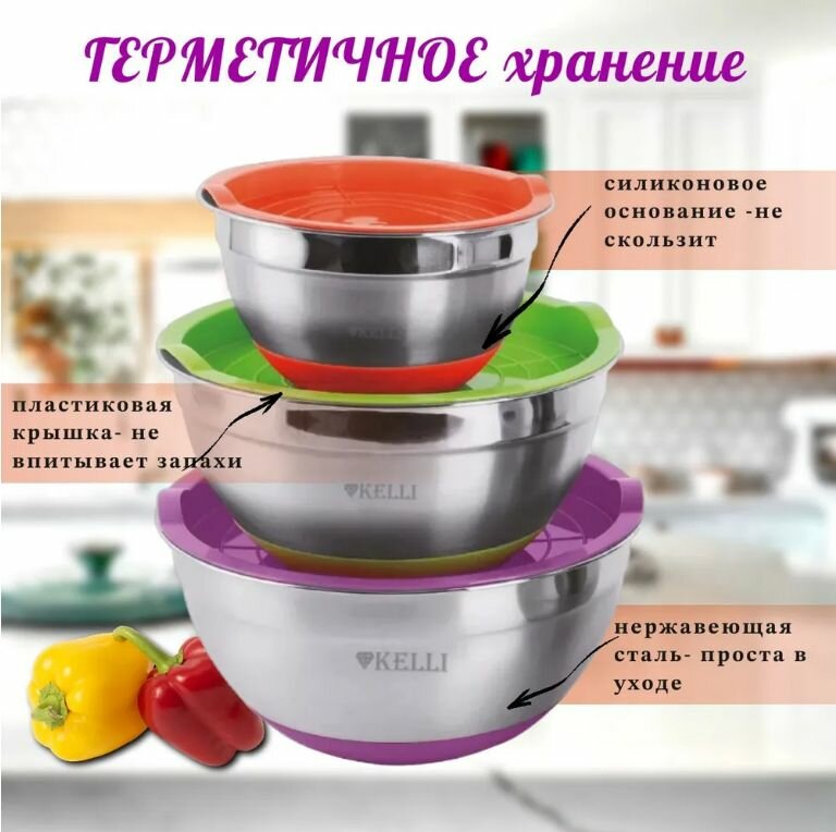 Набор салатников KELLI из нержавеющей стали с крышками для хранения и смешивания 3 шт из нержавеющей стали: сравнение цен, характеристики, фото, актуальное наличие и цены.