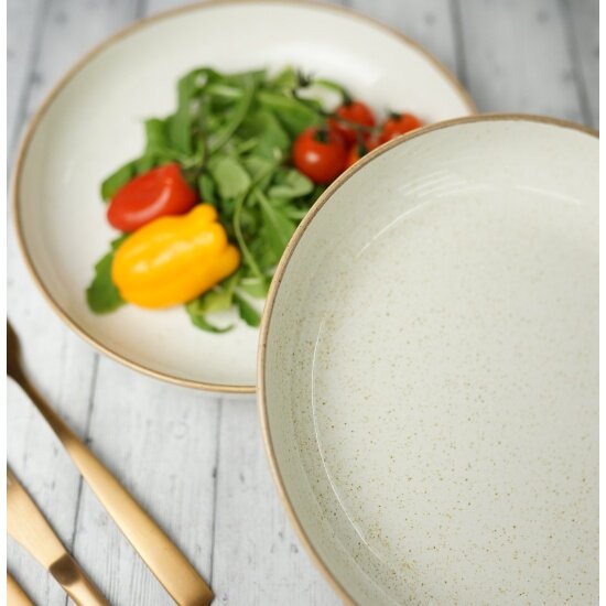 Porland Набор салатников Сизонс 22 см (2 предмета), бежевый, 835 мл . Всеми полюбившаяся коллекция Seasons бренда PORLAND представляет собой стиль Крафт и имеет лучшее соотношение цена качество на российском рынке. В данной серии представлено 5 цветовых решений: бежевый с вкраплениями, темно серый с вкраплениями, красный с вкраплениями, оранжевый с вкраплениями, бирюзовый с вкраплениями. Цвета и формы коллекции прекрасно сочетаются между собой, открывая простор для создания многочисленных вариантов оформления сервировки стола. Коллекция Seasons, состоящая из посуды разных размеров и форм, создавалась для стильного и красочного оформления ежедневных или званых обедов в ресторанах, кафе или дома. Отличительной особенностью данной линейки является двухсторонняя окраска изделия, на сегодняшний день только производство PORLAND может похвастаться данной технологией, не один производитель в мире не осуществляет подобное окрашивание изделий, что и делает коллекцию Seasons уникальной. Porland - пример высокого качества и аутентичного дизайна фарфоровых изделий. Как и вся посуда Porland, производится из всемирно известной английской глины и каолина по специальной запатентованной технологии. Качество фарфора Porland подтверждено сертификатом качества Британского института стандартов. Эта коллекция производится с использованием самых современных технологий. Фарфор, запекается при высокой температуре 1400 градусов С в течении 24 часов. Также, эта линейка фарфора отличается двухсторонней окраской изделий, что не делает ни один производитель в мире. ⠀Посуда Porland относится к профессиональному фарфору, который отличается утолщенными стенками, что делает его прочным и позволяет сохранять тепло приготовленного блюда. А благодаря особому составу двойной глазури блеск сохраняется навсегда. Эту посуду можно использовать в микроволновых печах и посудомоечных машинах. А дизайн посуды дает возможность легко очистить труднодоступные места.- Гарантия от сколов на края плоских предметов 10 лет- Инновационный состав глазури защищающий от царапин- Качество и экологичность продукции подтверждены международными сертификатами- Можно мыть в посудомоечной машине- Можно использовать в микроволновой печи