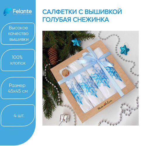 Салфетка с вышивкой "Голубая снежинка" от Felante - стильный и оригинальный аксессуар. Создана из 100% белоснежного хлопка и дополнена дизайнерской вышивкой. Размер 45х45 см. Cалфетки на стол, вышитые нитками, добавляют особое очарование и шарм к декору обеденного стола, создают настроение самого любимого праздника - Новый год.