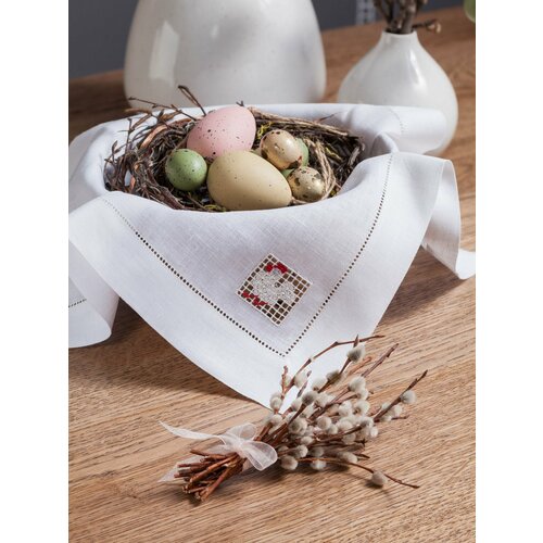 Изделия фабрики «Крестецкая строчка» вот уже более 100 лет славятся виртуозной техникой ручной вышивки. Каждый наш продукт – это результат многочасового труда мастериц. В изделиях Бренда "Крестецкая строчка" исторически сложившаяся геометрия традиционных узоров сочетается с современными тенденциями и технологиями, благодаря чему на свет появляются необычайно красивые, самобытные предметы столового текстиля, таких как данная пасхальная салфетка. Выполненная из высококачественного материала и украшенная вышивкой в виде пасхальной курочки эта сервировочная салфетка станет идеальным дополнением к вашему праздничному столу на Пасху, добавляя в атмосферу уюта и традиций. Вышивка символизирует светлые традиции и радость праздника, делая её не только красивым, но и значимым элементом сервировки. Универсальный размер салфетки 40x40 см удобен для использования как в качестве салфетки на стол или наподносника, а так же в качестве салфетки в корзину.