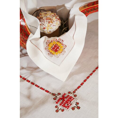 Изделия фабрики «Крестецкая строчка» вот уже более 100 лет славятся виртуозной техникой ручной вышивки. Каждый наш продукт – это результат многочасового труда мастериц. В изделиях Бренда "Крестецкая строчка" исторически сложившаяся геометрия традиционных узоров сочетается с современными тенденциями и технологиями, благодаря чему на свет появляются необычайно красивые, самобытные предметы столового текстиля, таких как данная пасхальная салфетка. Выполненная из высококачественного материала и украшенная контрастной вышивкой красными нитками по белому льну эта сервировочная салфетка станет идеальным дополнением к вашему праздничному столу на Пасху, добавляя в атмосферу уюта и традиций. Вышивка ХВ символизирует светлые традиции и радость праздника, делая её не только красивым, но и значимым элементом сервировки. Универсальный размер салфетки 40x40 см удобен для использования как в качестве салфетки на стол или наподносника, а так же в качестве салфетки в корзину.