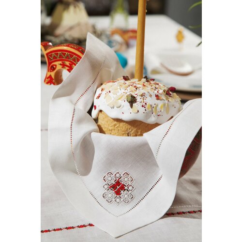 Изделия фабрики «Крестецкая строчка» вот уже более 100 лет славятся виртуозной техникой ручной вышивки. Каждый наш продукт – это результат многочасового труда мастериц. В изделиях Бренда "Крестецкая строчка" исторически сложившаяся геометрия традиционных узоров сочетается с современными тенденциями и технологиями, благодаря чему на свет появляются необычайно красивые, самобытные предметы столового текстиля, таких как данная пасхальная салфетка. Выполненная из высококачественного материала и украшенная контрастной вышивкой красными нитками по белому льну эта сервировочная салфетка станет идеальным дополнением к вашему праздничному столу на Пасху, добавляя в атмосферу уюта и традиций. Вышивка ХВ символизирует светлые традиции и радость праздника, делая её не только красивым, но и значимым элементом сервировки. Универсальный размер салфетки 40x40 см удобен для использования как в качестве салфетки на стол или наподносника, а так же в качестве салфетки в корзину.