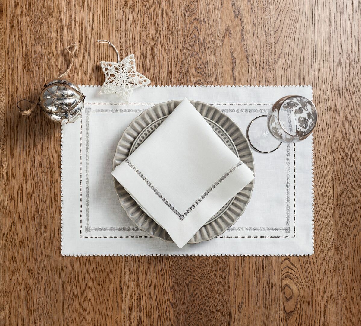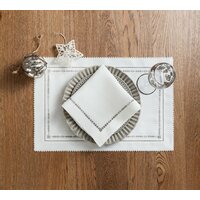 Тканевые плейсматы под приборы из льняного полотна классического белого цвета с изящной вышивкой светло-серыми нитками– оригинальный предмет сервировки, который создаст атмосферу праздника и уюта. Салфетки для сервировки с ручной вышивкой не только станут уникальным декором Вашего дома, но и достойным подарком на Новый Год и Рождество друзьям и близким.