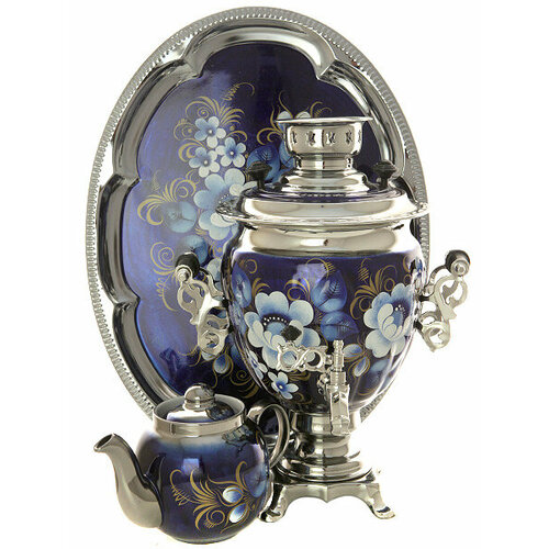 Набор самовар электрический 3 литра с художественной росписью «Жостово на синем фоне», арт. 140257: сравнение цен, характеристики, фото, актуальное наличие и цены.