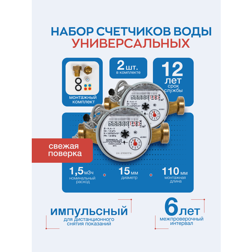 От производителя! Всегда свежая поверка. Счетчики воды/счетчики воды/прибор учета воды/водосчетчик ИПУ воды "пульс" 15У-110 крыльчатый,2 шт, импульсный, одноструйный, бытового назначения, для горячей и холодной воды, с муфтовым соединением, с Ду 15 мм. Несмотря на то, что счетчики "пульс" 15УИ-110 относятся к категории бытовых, они могут использоваться не только в квартирах и жилых домах, но и в других объектах - например, в административных зданиях или офисах. Единственное требование выдвигается к условиям эксплуатации: очень важно, чтобы давление в трубопроводе не превышало 1,6 МПа, а температура жидкой среды была не ниже +5 градусов и не выше +90 градусов. Водомер состоит из проточной части, крыльчатки, фильтра, счетного механизма и индикаторного устройства со шкалой. Корпус выполнен из нержавеющих материалов. Компоненты, вступающие в контакт с водой, не снижают ее потребительские качества и выдерживают перепады температур в заданном диапазоне. Допускается как вертикальный, так и горизонтальный монтаж. Срок службы 12 лет. Интервал между поверками 6 лет. Сведения о поверке размещены на портале фгис аршин, в разделе - сведения о результатах поверки средств измерений. Поставляется с монтажным комплектом, обратным клапаном, паспортом и руководством по эксплуатации. Вся продукция сертифицирована.