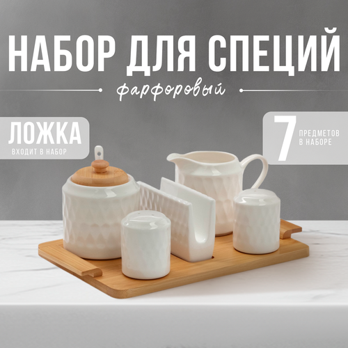 Купить Набор сервировочный Доляна «Эстет. Герда», 5 предметов: солонка 100 мл, перечница 100 мл, сахарница с ложкой 350 мл, молочник 310 мл, салфетница, цвет белый с доставкой по всей России. Набор сервировочный Доляна «Эстет. Герда», 5 предметов: солонка 100 мл, перечница 100 мл, сахарница с ложкой 350 мл, молочник 310 мл, салфетница, цвет белый: сравнение цен, характеристики, фото, актуальное наличие и цены.