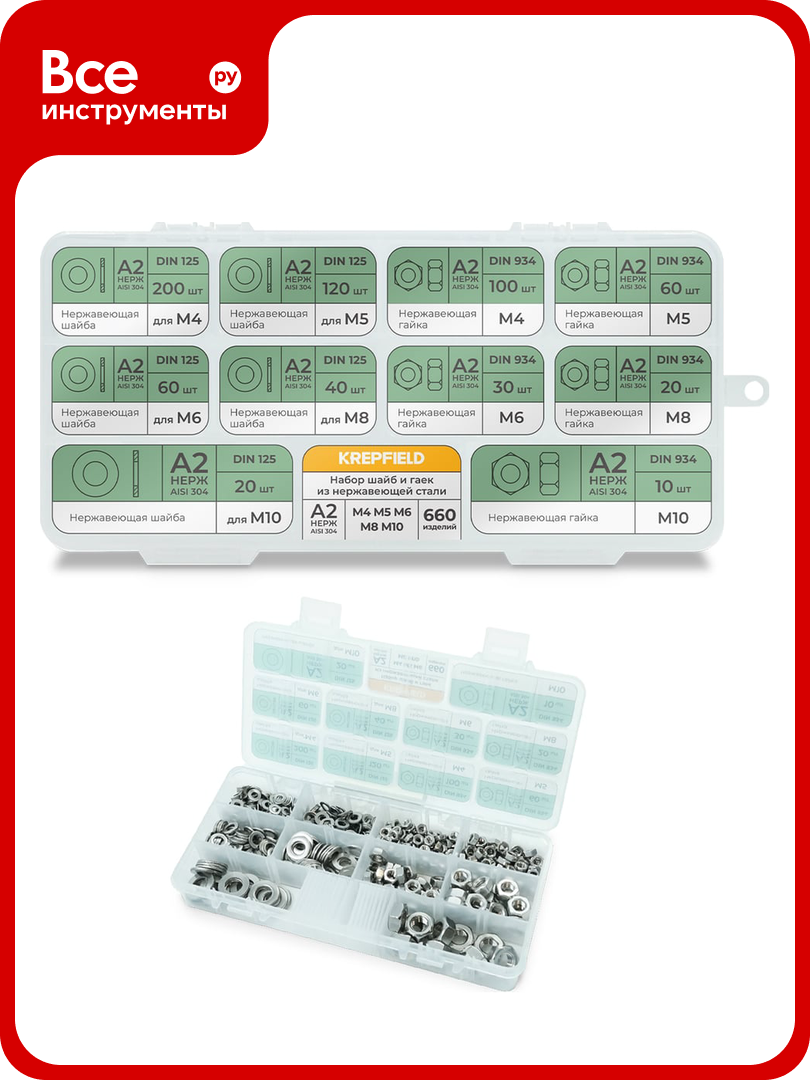 Набор шайб и гаек из нержавеющей стали KREPFIELD М4, М5, М6, М8, М10, 660 предметов в кейсе Набор10метрика660: сравнение цен, характеристики, фото, актуальное наличие и цены.