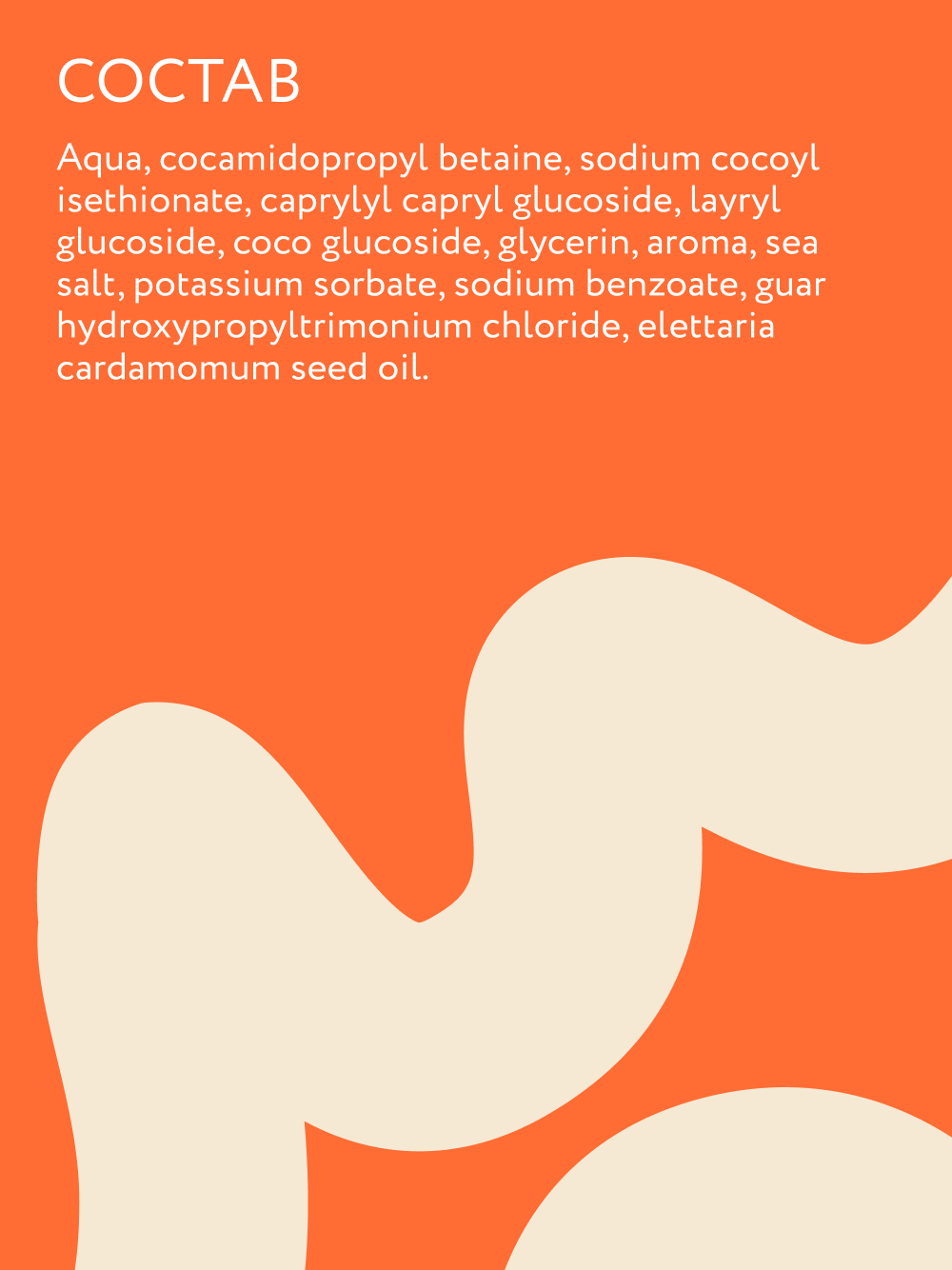 | Состав | Aqua, Cocamidopropyl Betaine, Sodium Cocoyl Isethionate, Alkyl Polyglucoside, Lauryl Glucoside, Coco Glucoside, Glycerin, Aroma, Sea salt, Guar Hydroxypropyltrimonium Chloride, Elettaria cardamomum (Cardamom) Seed Oi, Potassium Sorbate, Sodium Benzoate, Aloe Barbadensis Leaf Juice, Saponaria Officinalis Root Extract, Maltodextrin, Hydrolyzed Wheat Protein, Aroma, Arginine, Oryza Sativa (Rice) Seed Extract (and) Saсcharomyces Ferment Lysate Filtrate, Panthenol, Citric Acid, Benzyl Alcohol, Potassium Sorbate. |