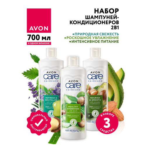 В набор входит: Шампунь-кондиционер для волос Avon 2в1 Роскошное увлажнение 700 мл; Шампунь-кондиционер для волос Avon 2в1 Природная свежесть 700 мл; Шампунь-кондиционер для волос Avon 2в1 Интенсивное питание 700 мл. Шампунь-кондиционер 2в1 от Avon мягко устраняет загрязнения и избыток себума с волос. Восстанавливает структуру, придавая прядям здоровый вид и естественное сияние. Шампунь-кондиционер Природная свежесть дарит ощущение свежести как волосам, так и коже головы. Кондиционер улучшает упругость и гибкость волос. Шампунь-кондиционер Интенсивное питание питает волосы, делая их гладкими. Кондиционирующий компонент делает волосы послушными и легкими для укладки.