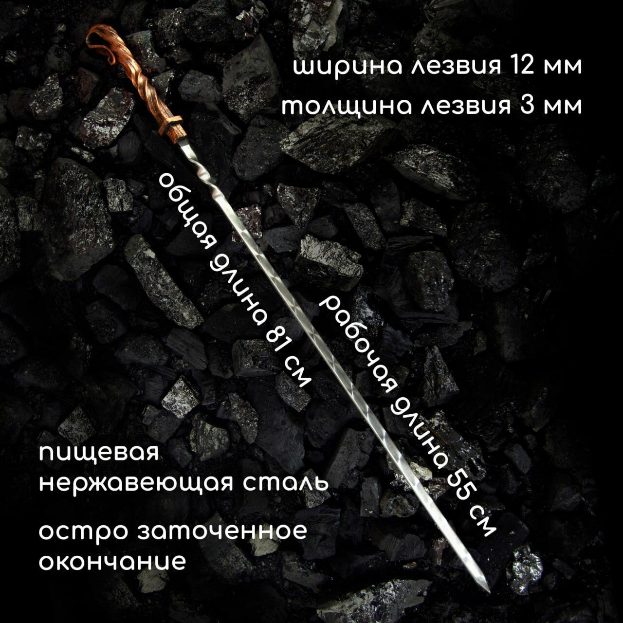 Толщина лезвия – 3мм ⠀ Длина лезвия (рабочая длина) – 550мм (55см)⠀ Общая длина шампура – 81см Ширина лезвия – 12мм (1,2см)