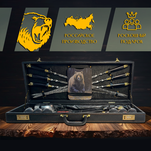 Набор шампуров в чемодане "Медведь" - шикартный подарок мужчине! В комплекте есть все необходимое для того, чтобы приготовить шашлык и насладиться им в компании семьи или друзей. Шампура с деревянной ручкой изготовлены из нержавеющей стали AISI430. Кроме того, что они изготовлены только из премиальных материалов, они еще и имеют красивый вид! Золотые головы зверей на концах рукояти изготовленны при помощи художественного литья латуни. Шампура с животными имеют комфортную рабочую длину 50 см и оптимальную толщину стали 3 мм. Кроме того, в наборе есть нож туристический и топорик для мяса - оба изделия с головой зверя. А на разделочной доске - декоративное изображение медведь! Весь набор смотрится шикарно! Он имеет идеальную комплектацию, где каждое изделие еще и внешне сочетается между собою. Набор шампуров с головам зверей станет идеальным подарком мужчине! Набор шампуров подарочный изготовлен на территории России и имеет длительный срок эксплуатации. Каждый мужчина, ценящий качество и красоту, оценит такой подарочный набор по достоинству!
