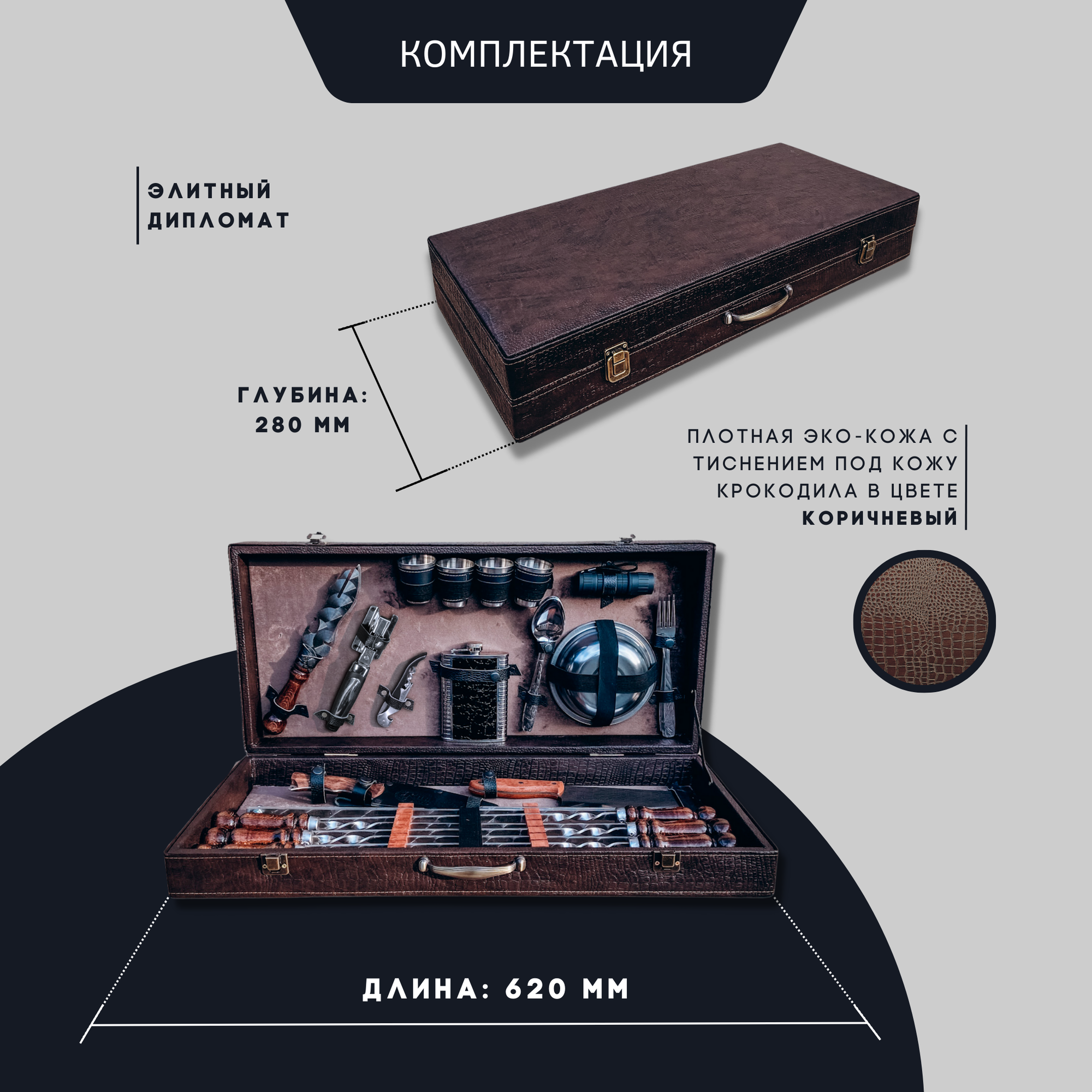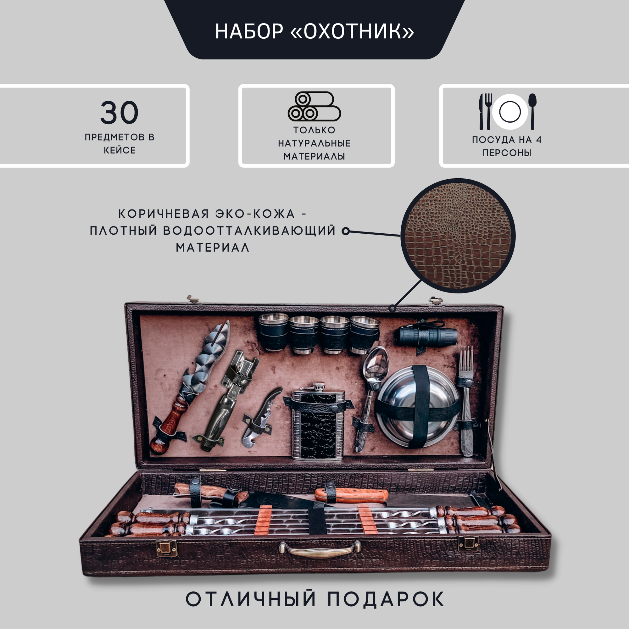 Подарочный набор шампуров для пикника «охотник» - набор аксессуаров для мангала и пикника на природе. В наборе есть все необходимые принадлежности, которые обеспечат комфортное приготовление шашлыка в любых условиях (дома или на природе). Шампура имеют прочную конструкцию и могут выдерживать разом 3-4 кг мяса! Качество используемых материалов в изготовлении изделий, гарантирует прочность, износостойкость и длительный срок эксплуатации! Такой солидный набор для мужчины станет уникальным и полезным подарком мужчине на 23 февраля, День рождение, Новый год или любой другой праздник! Кейс выполнен из плотной эко-кожи и жесткой породы дерева. Чемодан обеспечивает удобство и безопасность хранения и транспортировки!