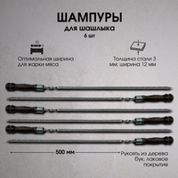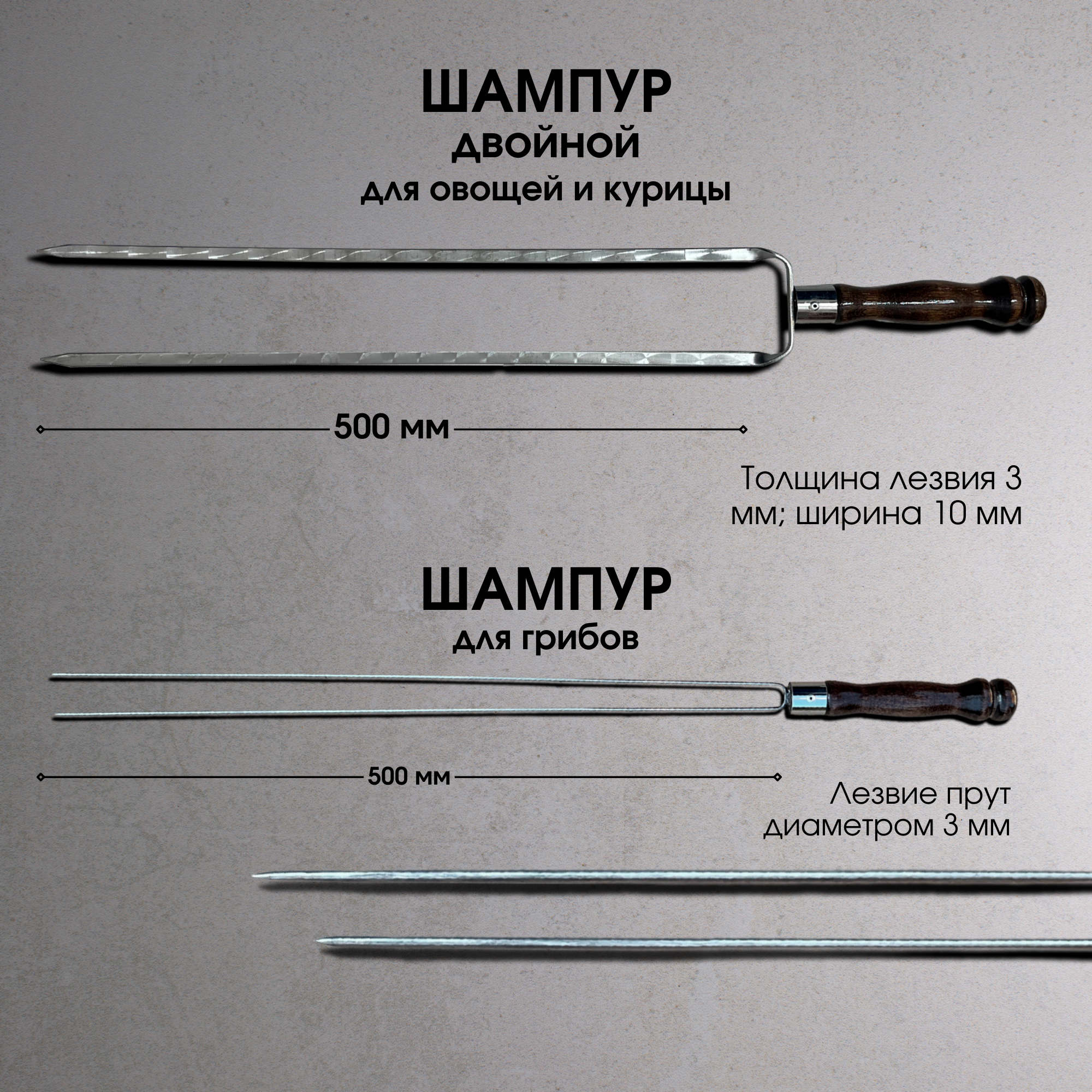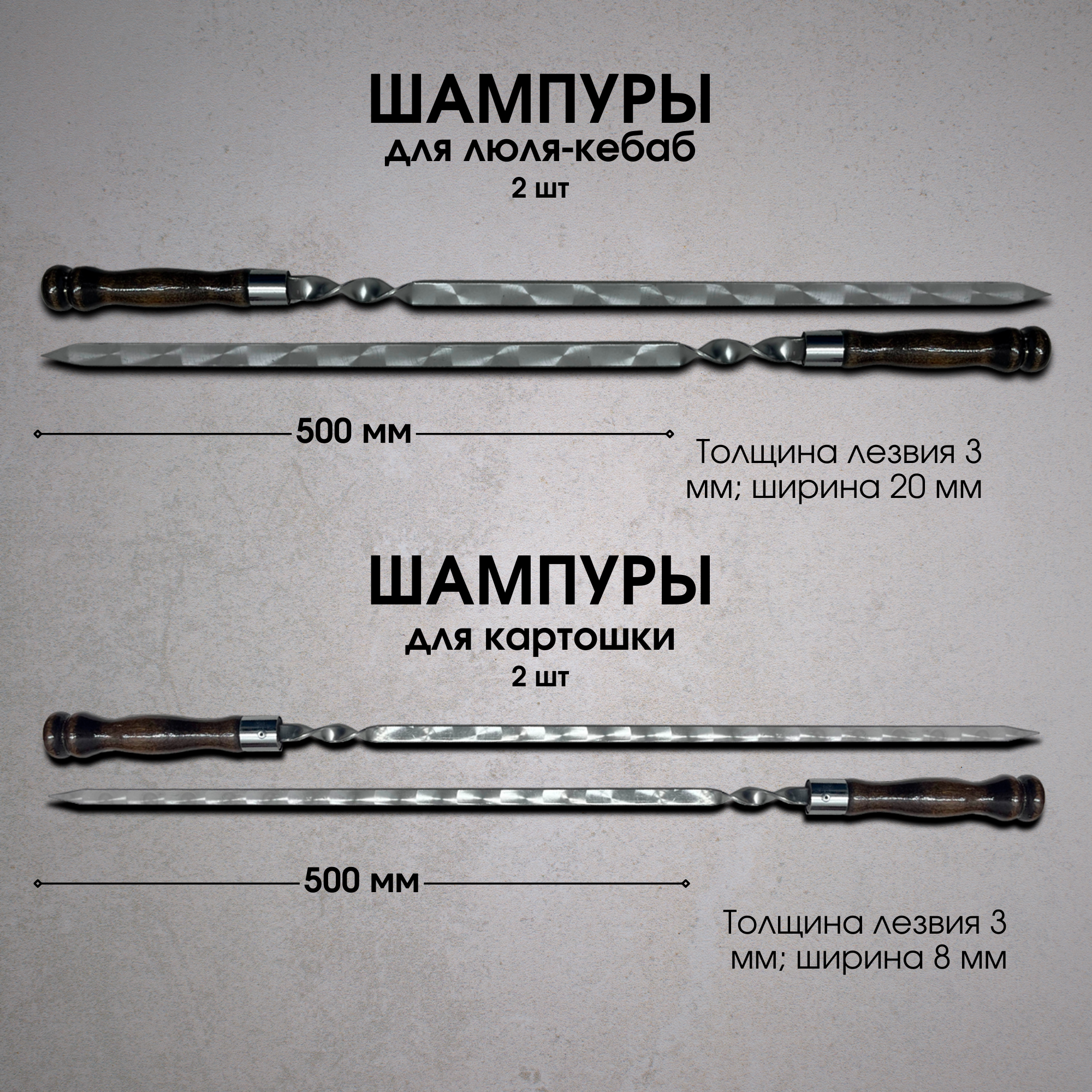 шампуры для люля-кебаб - 2 шт. Шампура для картошки - 2 шт. Шампура для шашлыка - 6 шт. 1 шампур-вилка для курицы и овощей. 1 шампур-спица для грибов.