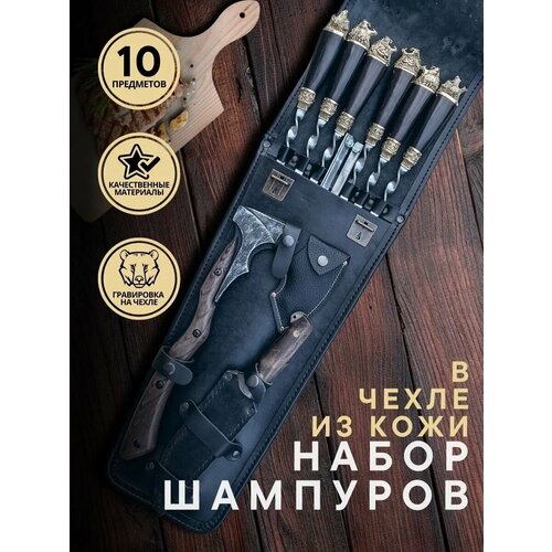 Этот шашлычный набор - действительно изящная ручная работа от лучших мастеров Кавказа, с использованием только натуральных и высококачественных материалов: чехол из натуральной кожи, ручки из натурального дерева Ясень, металл - нержавеющая пищевая сталь. Так же в наборе имеется отличный кованый топор из стали СТ45 и Нож разделочный из стали 65Х13. Производство в России, Дагестан г. Кизляр. Набор шампуров кизлярский - отличный подарок мужчине на 23 февраля день защитника отечества, на день рождения, новый год. Мужской набор позволит приготовить вкусный шашлык дома или на пикнике в любое время года!
