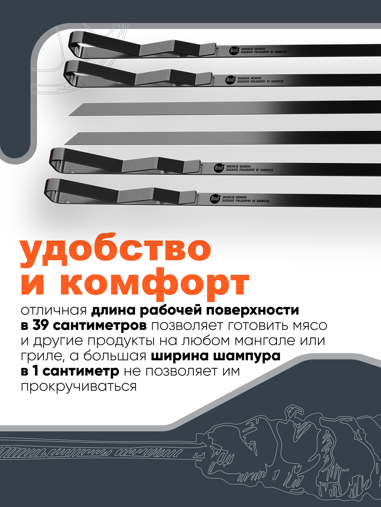 Длинные шампуры из долговечной нержавеющей стали. С ними можно как готовить шашлыки и кебабы, на гриле, на мангале или якитори, так и подавать их к столу.