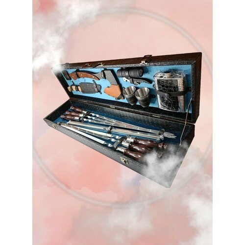 - шампуры с деревянной ручкой– 6шт.; - складной мангал «Таганок» - 1шт.; - стопки 70 мл – 4 шт.; - штопор мультитул – 1шт.; - кухонный топорик с чехлом – 1шт., - фляжка с декоративной вставкой 250 мл – 1шт.; - фонарик (без элемента питания, ААА -3шт.) – 1шт.: - бензиновая зажигалка в стиле ZIPPO - 1шт.; -туристический нож из твердой стали 65х13 с чехлом производства г. Кизляр – 1шт.