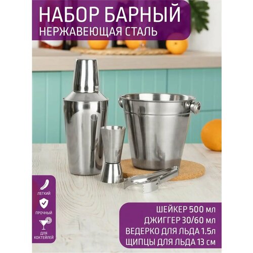 Для дома и профессионального бара. Подходит для мытья в посудомоечной машины. Барный набор 4 предмета: - шейкер 0,5л; - джиггер 30/60 мл; - ведро для льда 1,5 мл; - щипцы для льда 13 см.