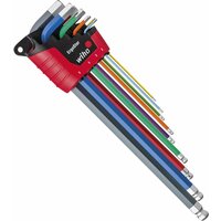 Набор ключей-шестигранников Г-образных (имбусовых) с профилем HEX с шаром со свечением Wiha серии 369F (артикул 41483) содержит 9 предметов и поставляется в пластиковом блистере ErgoStar. Применяется для обслуживания метрического резьбового крепежа (винты, саморезы), оснащённого внутренним шестигранным рабочим профилем.