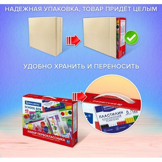 Все самые необходимые школьные принадлежности упакованы в удобный чемоданчик с ручкой. Состав набора: - ручка шариковая синяя - 2 шт;- ручка шариковая зеленая - 1 шт;- ручка шариковая черная - 1 шт;- ручка шариковая красная - 1 шт; - карандаш чернографитный - 3 шт; - ластик - 1 шт; - точилка - 1 шт; - линейка 20 см - 1 шт;- карандаши цветные 6 цветов - 1 шт; - тетрадь в клетку 12 л. - 5 шт; - тетрадь в линейку (частая косая) 12 л. - 5 шт;- обложки для тетрадей - 10 шт; - цветная бумага 8 цветов - 1 шт; - картон цветной 10 цветов - 1 шт; - пластилин 6 цветов - 1 шт;- ножницы, 130 мм - 1 шт;- клей-карандаш - 1 шт;- альбом для рисования 20 л. - 1 шт. - гуашь 6 цветов - 1 шт;- краски акварельные 6 цветов - 1 шт;- фломастеры 6 цветов - 1 шт;- кисти для рисования - 2 шт;- короб подарочный - 1 шт. Набор представляет собой подарочную коробку-чемоданчик из плотного картона с красочным дизайном и наполнением. Подарочный короб дополнительно упакован в бурый гофрокороб. Состав набора разработан на основе рекомендаций учителей и пожеланий родителей таким образом, чтобы обеспечить юного ученика всем необходимым. В состав набора входят только высококачественные сертифицированные отечественные и импортные школьные принадлежности, соответствующие требованиям безопасности детских товаров законодательства РФ.