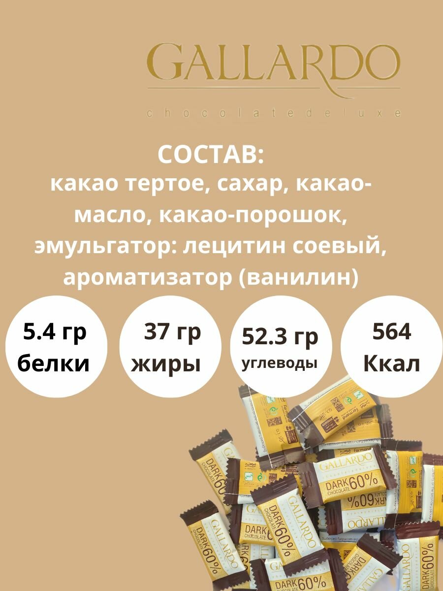 Купить Набор шоколада Gallardo горький 60% порционный, 60 шоколадок по 5 грамм с доставкой по всей России. Набор шоколада Gallardo горький 60% порционный, 60 шоколадок по 5 грамм: сравнение цен, характеристики, фото, актуальное наличие и цены.