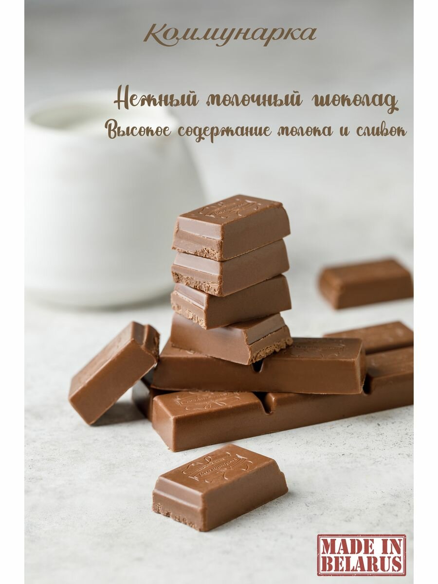 Шоколад «Коммунарка» молочный. Содержание какао-продуктов — 31,4 %. Состав: Сахар, какао-масло, сливки сухие, какао тертое, сыворотка молочная сухая, эмульгаторы (лецитин соевый, Е476), ароматизатор натуральный "Ваниль", соль пищевая йодированная. Нежный молочный шоколад с тонким ароматом ванили, в котором содержится магний, участвующий в белковом, фосфорном и углеводном обмене, необходимый для здоровья нервной системы. Благодаря высокому содержанию молока и сливок присутствуют такие жизненно важные микроэлементы как кальций и калий. Плиточный шоколад Коммунарка станет отличным подарком к любому празднику, ко дню матери, Новому году, 8 Марта и приятным дополнением к любому столу. Наши шоколадные наборы и конфеты - это кондитерский изыск! Кроме этого, каждый шоколадный стик упакован в индивидуальную фольгу благодаря чему вы сможете легко регулировать количество употребляемого шоколада и даже рассчитать калории, если это необходимо, т. к. на упаковке вы увидите конкретное количество калории в каждом стике. Натуральный полезный шоколад с минимальным содержанием сахара, ведь без сахара не вкусно, для правильного питания, всегда будет главным показателем качества нашей фабрики. Помните, что еда должна быть полезной, поэтому стоит выбирать низкокалорийные продукты! Подари наш шоколад любимой женщине или бабушке, маме, сыну или дочке, а может другу или коллеге, ведь Белорусский шоколад не уступает Бельгийскому, и мы гордимся этим! Наш шоколад съедается до последней крошки или капли! Наши шоколадки и сладости самые вкусные и полезные! Одна вкусняшка от кондитерской фабрики Коммунарка и Ваше сердце останется с нами навсегда.