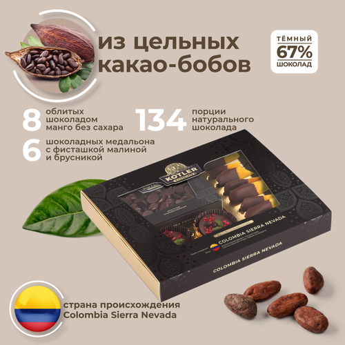 Подарочный набор шоколада из цельных бобов бренда KOTLER Choсolate (шоколад котлер) COLOMBIA SIERRA NEVADA. Шоколад натуральный произведен по технологиям bean to bar (бин ту бар). Производится по технологии 19 века, которая позволяет изготавливать настоящий продукт из бобов, а не из суррогата. Bean-to-bar (дословный перевод - от боба до плитки) - это технология изготовления шоколада в пределах одного производства, начиная с выбора какао-бобов, их обжарки, обработки и заканчивая упаковкой готовых плиток. Для приготовления бинтубар шоколада, в отличие от фабричного, используются редкие и дорогие сорта какао-бобов. Именно поэтому, а также из-за большой доли ручного труда, этот шоколадный набор дороже даже многих премиальных марок, которые можно встретить на полках магазинов. Одним из главных преимуществ этого лакомства, производимого по технологии bean-to-bar, является его состав. В основе только оригинальные какао бобы, какао масло, полученное практически из них же холодным отжимом и нерафинированный тростниковый сахар с низким гликемическим индексом. В промышленном производстве шоколадных продуктов, для удешевления его стоимости, вместо какао-тертого (так называют перетертые какао-бобы) могут использовать какао-порошок (это жмых от какао-тертого без какао масла), заменители растительных жиров, этиловый спирт, дешевые сорта сахара, ванилин. В нашем производстве бобы тщательно сортируются, а все бобы с нарушенной оболочкой удаляются. Так же полностью удаляется все внешняя оболочка боба (велла), которая в массмаркет продукте вся идет в производство, а это иногда до 30% общей массы! Наше изделие обладает бархатистым вкусом и тает во рту, оставляя насыщенное шоколадное послевкусие с многообразием оттенков: экзотическое дерево, грецкий орех, спелые красные ягоды, черная смородина. В подарочной упаковке входит: манго, облитое шоколадом в количестве 8 штук. Медианты с малиной, фисташкой и брусникой. Тёмный шоколад в форме кофейных зерен 100г. Такое шоколадное лакомство полезный подарок на 14 февраля, папе на 23 февраля, маме на 8 марта, на день рождения другу или подруге, а также на пасху или на новый год. Он может быть как новогодний подарок. Наше эксклюзивное сладкое изделие безусловно порадует приятным вкусом ремесленного черного шоколада вашу маму, папу, бабушку или дедушку, а также всех близких. Идеально подойдет в качестве корпоративного подарка. Мы все заранее продумали, набор уже упакован в премиальную подарочную коробку и его остается только подарить. Ваша любовь в красивой упаковке! Происхождение бобов: колумбия сиерра невада. Мы не используем никаких генно-модифицированных/химических добавок и наш товар без ГМО, без консервантов, без ароматизаторов, без красителей, без усилителей вкуса, без глютена, а также веганский шоколад не только диетический, но и вегетарианский, что делает его идеальным выбором для людей, следящих за своим питанием. Шоколад котлер Настоящий для настоящих!