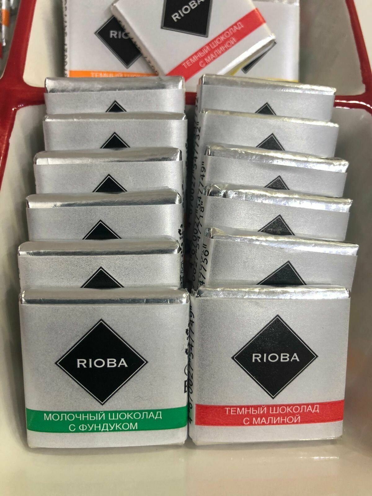 Набор шоколада RIOBA mini 60 шт по 5 гр упакован в картонную коробку, что обеспечивает сохранность продукта во время транспортировки.