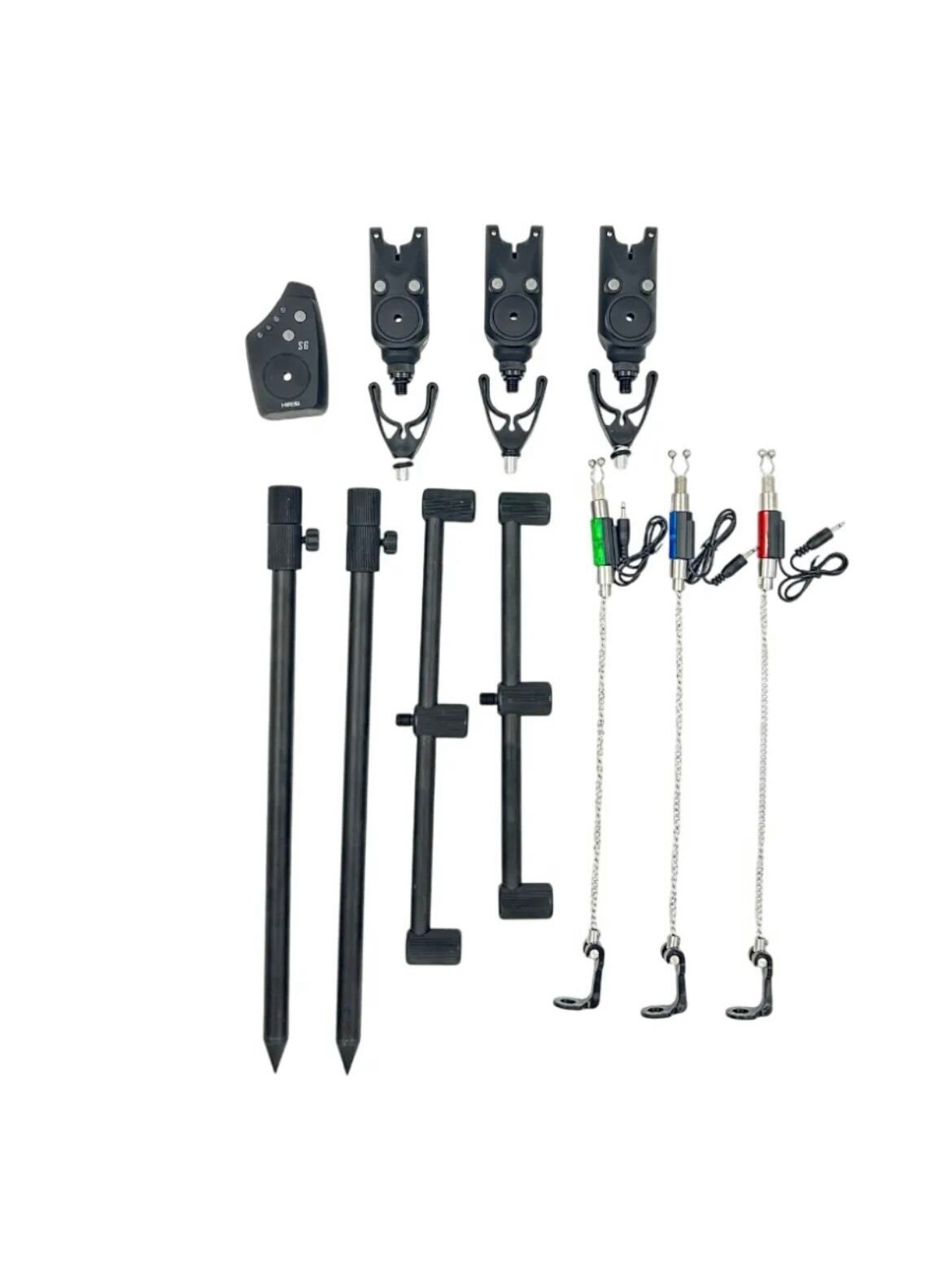 Беспроводные сигнализаторы клева HIRISI для карповой ловли и фидера с пейджером и свингерами в сумке для переноски - 3 + 1. Набор состоит из 3-х электронных сигнализаторов поклевки с пейджером, подставок стоек буз бар (buzz bar) под 3 удилища, а также светодиодных индикаторов клева для рыбалки, которые предназначены для ловли рыбы на несколько удочек и устанавливаются на рыболовную снасть. Датчики клева оснащены резьбой для их крепления на подставку под удочку или род под, световым и звуковым видами оповещения. Детекторы поклевки фидерные имеют широкий функционал и влагозащитный корпус, при этом не займут много места в Вашем рыболовном снаряжении. Элемент питания сигнализатора и пейджера – батарейка типа ААА. Отличное приобретение для каждого рыболова, который ценит свой комфорт, а также превосходный подарок рыбаку на день рождения, новый год, 23 февраля.