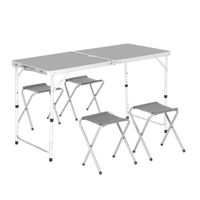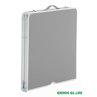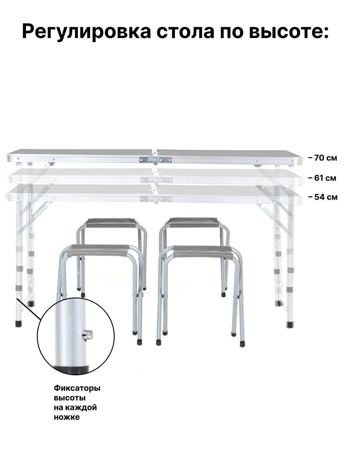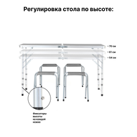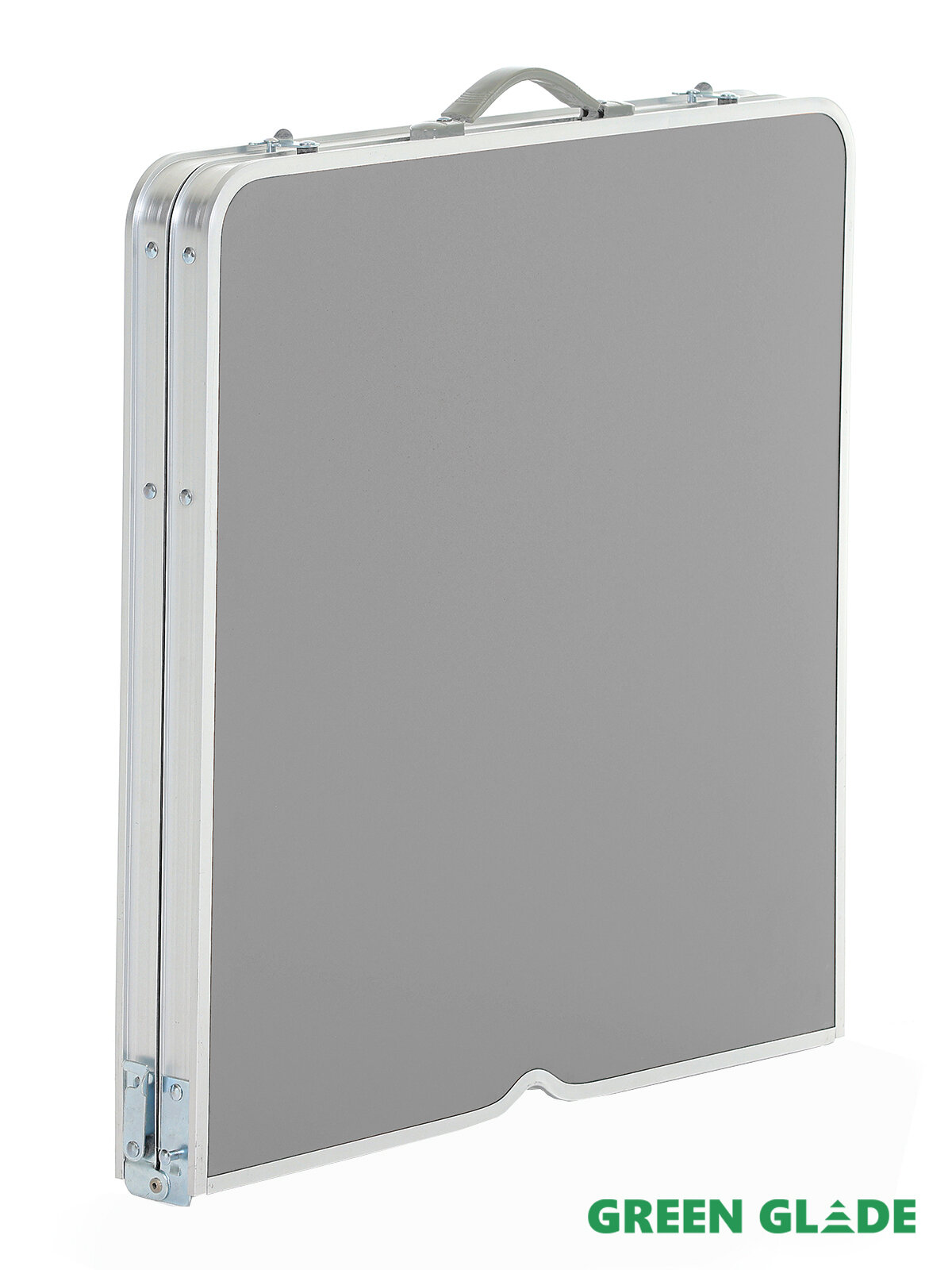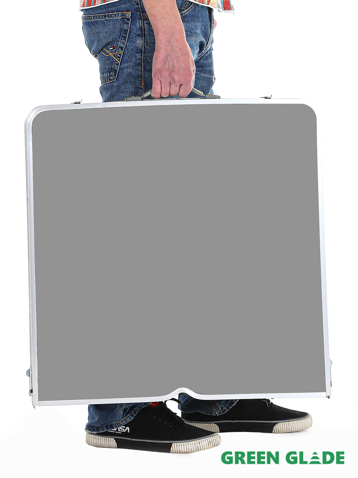 Удобный набор складной мебели Green Glade просто незаменим для отдыха на природе. Набор включает в себя большой складной стол и четыре стула-табурета. Стол имеет прочный алюминиевый каркас и влагостойкую столешницу. Ножки регулируются по высоте. В центре стола есть отверстие для установки садового зонта. Стол легко складывается в компактный чемодан с ручкой для переноски, стулья помещаются внутри.