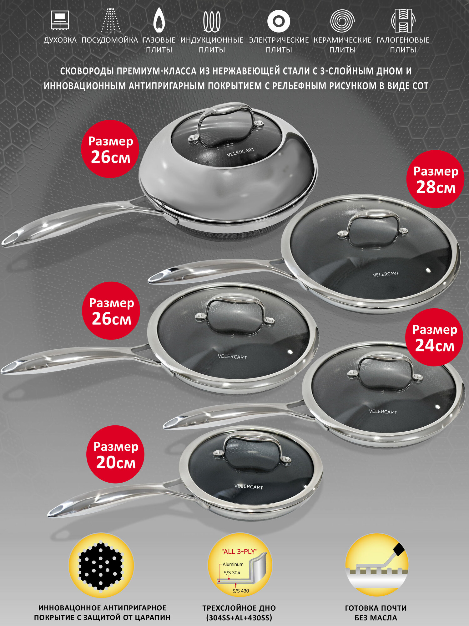 Набор сковород VELERCART премиум-класса из нержавеющей стали высочайшего качества, с 3-слойным дном и инновационным антипригарным покрытием с рельефным рисунком в виде сот. Такие сковороды легко мыть и при готовке можно пользоваться металлическими кухонными принадлежностями!