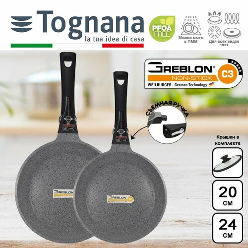 Набор индукционный из сковороды 20см (высота борта 5см) - 1шт; сковороды 24см (высота борта 5см) - 1шт с крышками. Сочетание эксклюзивного дизайна и сертифицированного качества делают продукцию Tognana на 100% удовлетворяющей желания потребителей. Высококачественная посуда для приготовления с антипригарным покрытием не содержит вредных веществ и позволяет превратить процесс приготовления в удовольствие. Здоровое питание также означает здоровое приготовление пищи с сертифицированной посудой, которая не выделяет вредных веществ в пищу, что позволяет готовить деликатно в отношении продуктов питания и окружающей среды и что делает время, затрачиваемое на приготовление, легким и увлекательным. Это идеальный инструмент для здоровой и повседневной кухни, для приготовления овощей, рыбы, постного мяса на медленном или сильном огне. Многослойное антипригарное покрытие. Материал чистый алюминий. Толстое дно. Не нагревающиеся ручка. Без PFOA (перфтороктановая кислота) и без APEO (алкилфенолэтоксилатов). Легко моется и обладает высокой устойчивостью к царапинам.