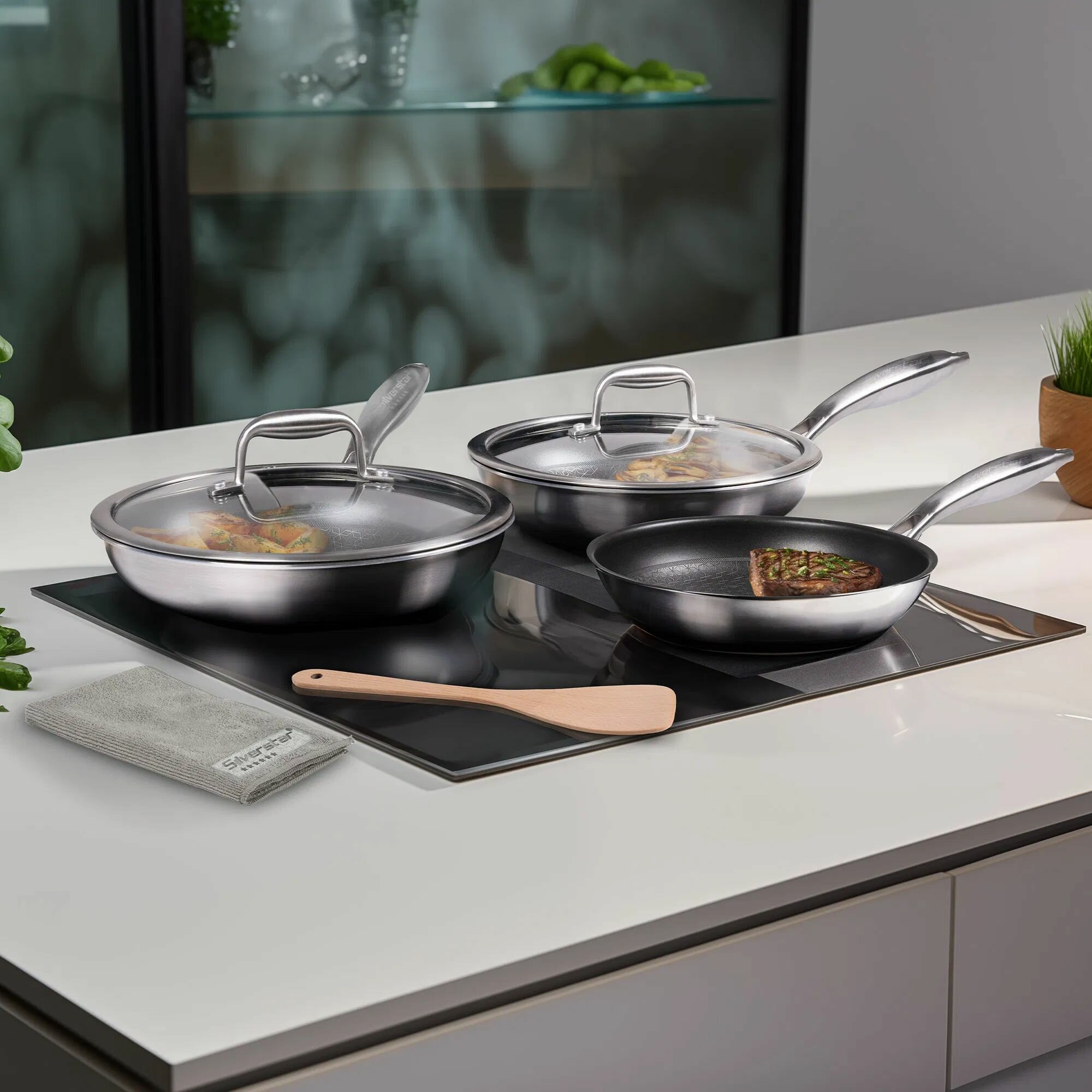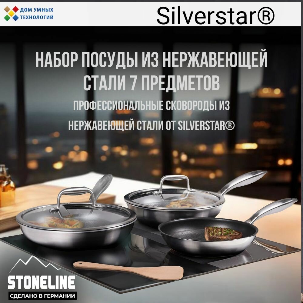 Когда дело доходит до сковороды для приготовления идеального стейка , это лучший выбор: профессиональные сковороды из нержавеющей стали от Silverstar®! Запатентованные сковороды сочетают в себе лучшие свойства сковород из нержавеющей стали и сковород с антипригарным покрытием .