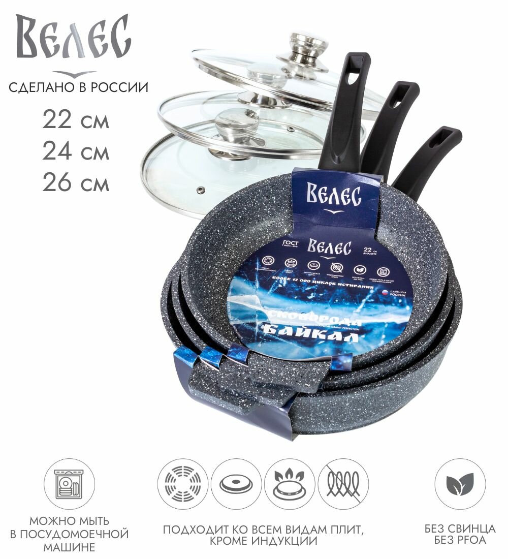 Набор сковородок 3шт.(22см/24см/26см) с 7-слойным антипригарным ЭКО покрытием байкал, крышки, велес: сравнение цен, характеристики, фото, актуальное наличие и цены.