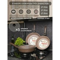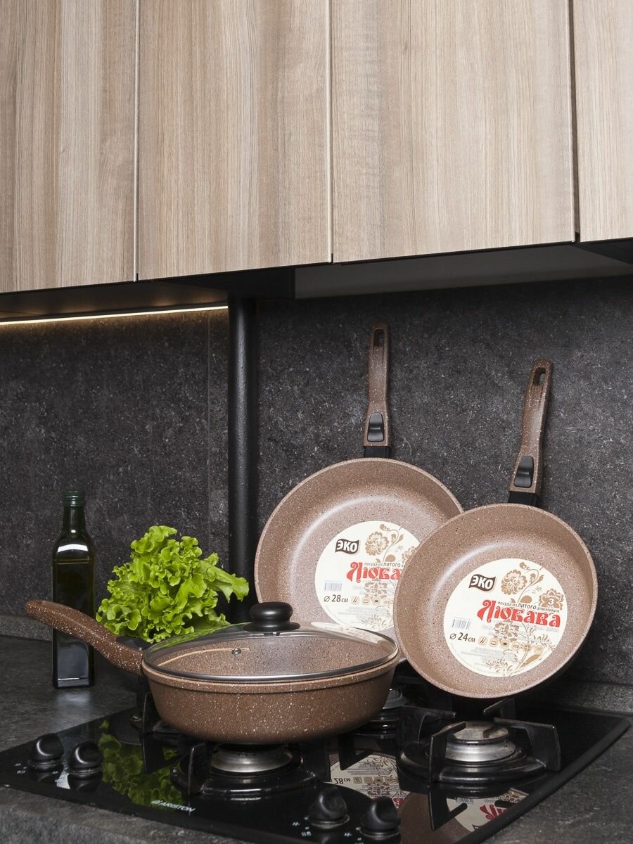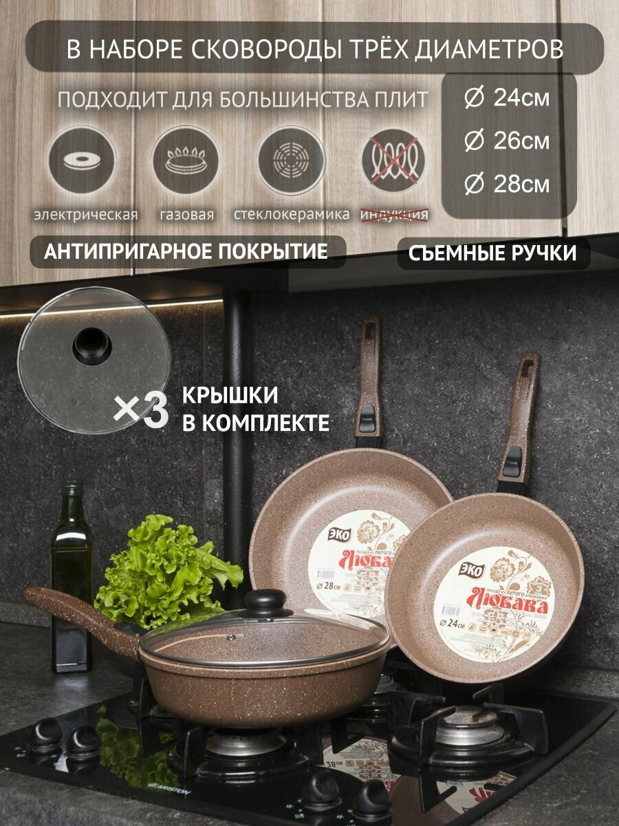 Набор глубоких литых сковород Любава со съёмными ручками, антипригарным покрытием и крышками всех диаметров в комплекте навсегда займет главное место на вашей кухне. Тяжелая посуда с утолщенным дном. Устойчивы к воздействию металлическими приборами, такими как ножи. В качестве подставки под сковороду может служить разделочная доска из дерева. Не содержат вредных веществ и химии, в том числе пфоа, свинца и кадмия. Идеально подходят для приготовления любых видов блюд, будь то мясо, овощи, яичница и омлеты, блины, оладья, гарниры, плов и даже гриль. Благодаря толстому дну, равномерному нагреву и распределению тепла позволяют не пережаривать пищу. Бережно тушат, приготовят полезную и здоровую еду практически без использования масла, подходят для выпечки! Совместимы с газовыми, электрическими, стеклокерамическими плитами, а также с духовками. Диаметр сковородок 20, 22, 24, 26 и 28 сантиметров, что позволяет готовить впрок. Подходят под любые крышки 20-28 см. Толщина основания 7 мм, стенок - 4.5 мм. Произведены из литого алюминия под высоким давлением - настоящая кухонная утварь! Помимо наборов сковородок вы можете найти отличные наборы кастрюль, блинницы, ковшики кухонные и прочий кухонный инвентарь из долговечных материалов, которые прослужат вам не один десяток лет. Более того, вам не нужен антижир, azelit (азелит) и прочие чистящие средства, достаточно мочалки и капли моющего средства, например, grass. Наша продукция сделана в России с любовью и заботой! Отлично подойдет и для активного отдыха, ведь ее можно взять в туристический поход или на пикник (оценено рыболовным лагерем). С Любавой вы напрочь забудете о посуде из ikea (икеа)! Также набор послужит прекрасным подарком к новому году близким и друзьям - прекрасная посуда для кухни, которая не оставит равнодушной ни одну хозяйку, ведь это настоящая Мечта!
