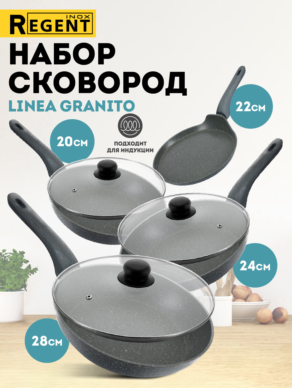 Набор сковородок с крышками 20 см, 24 см, 28 см и блинница для индукционной плиты Regent inox: сравнение цен, характеристики, фото, актуальное наличие и цены.