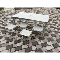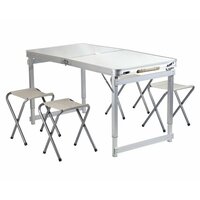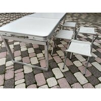 Комплект складной мебели для семейного отдыха на природе, состоящий из стола и 4-х стульев, который не займет много места в машине, металл сверхусиленный, столешница 5-ти слойная. При установке на неровную поверхность, высоту ножек стола можно слегка отрегулировать с помощью пластиковых шайб в основании каждой ножки. В собранном виде набор не занимает много места -4 стула компактно складываются в стол, столешница складывается пополам в плоский чемоданчик с ручкой для переноски. Покрытие походного стола - водостойкое, устойчивое к пятнам и легко очищающееся.