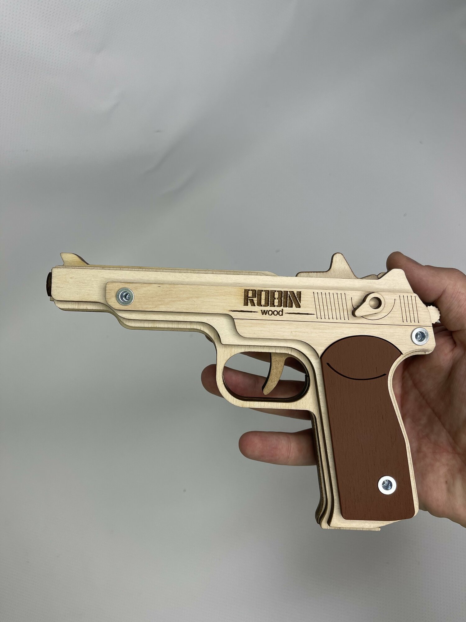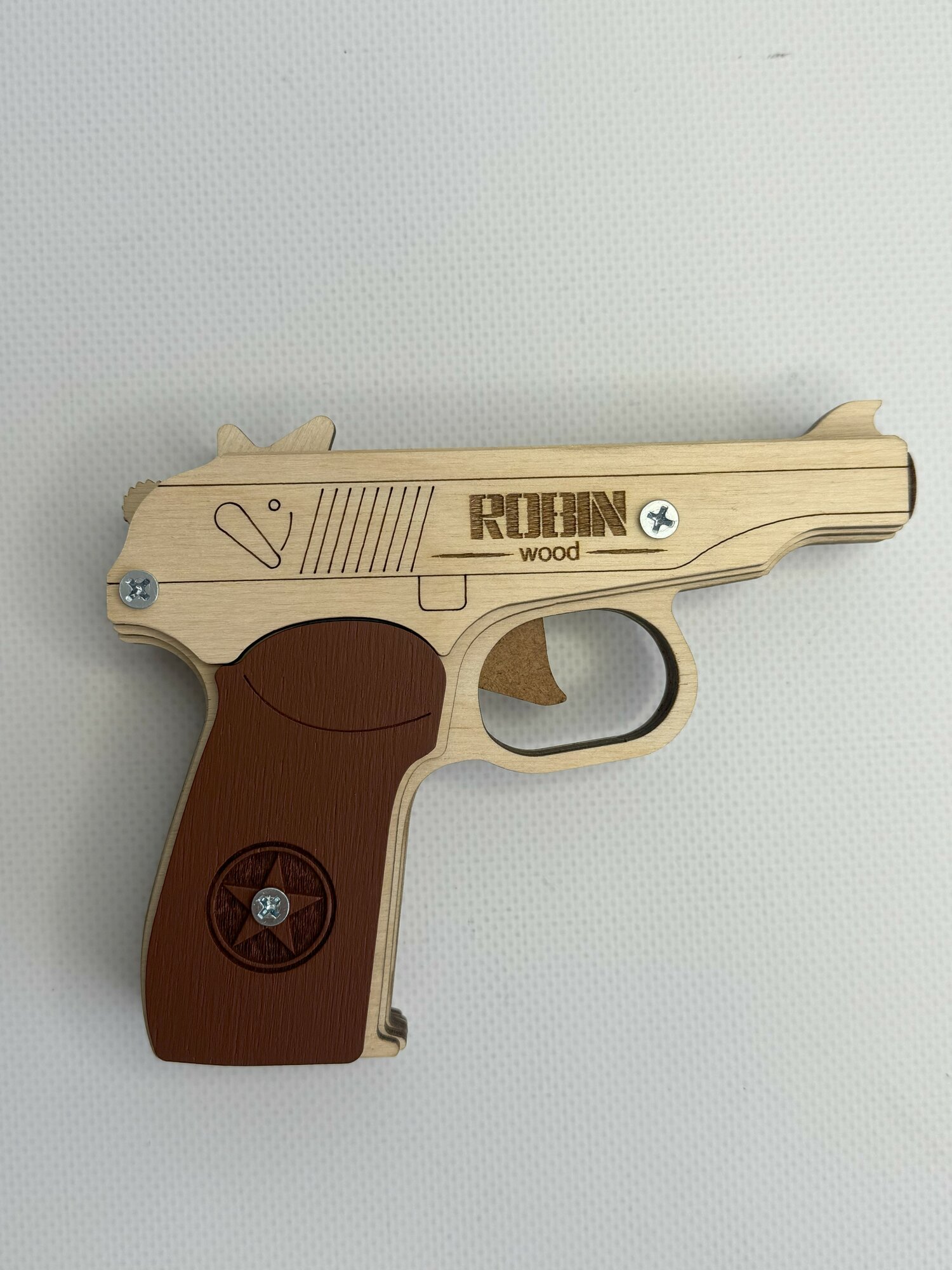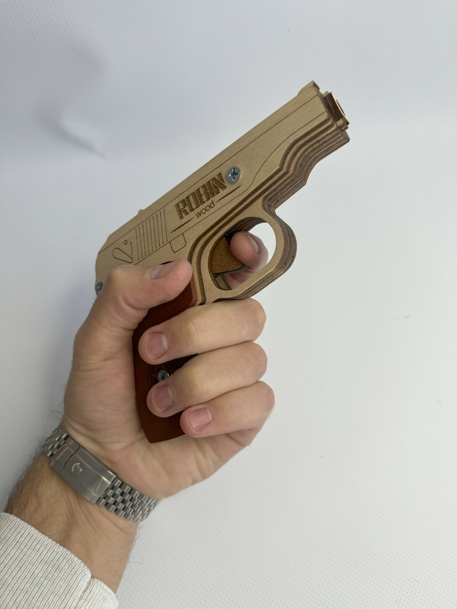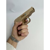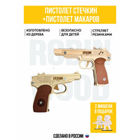размеры пистолета Стечкина: 200 * 140 * 31 мм, пистолета Макарова: 154 * 124 * 28 мм; покрыты акриловой краской на водной основе; сделаны из твердых пород дерева; нержавеющая металлическая фурнитура; покраска и сборка производятся вручную; для детей от 3 лет