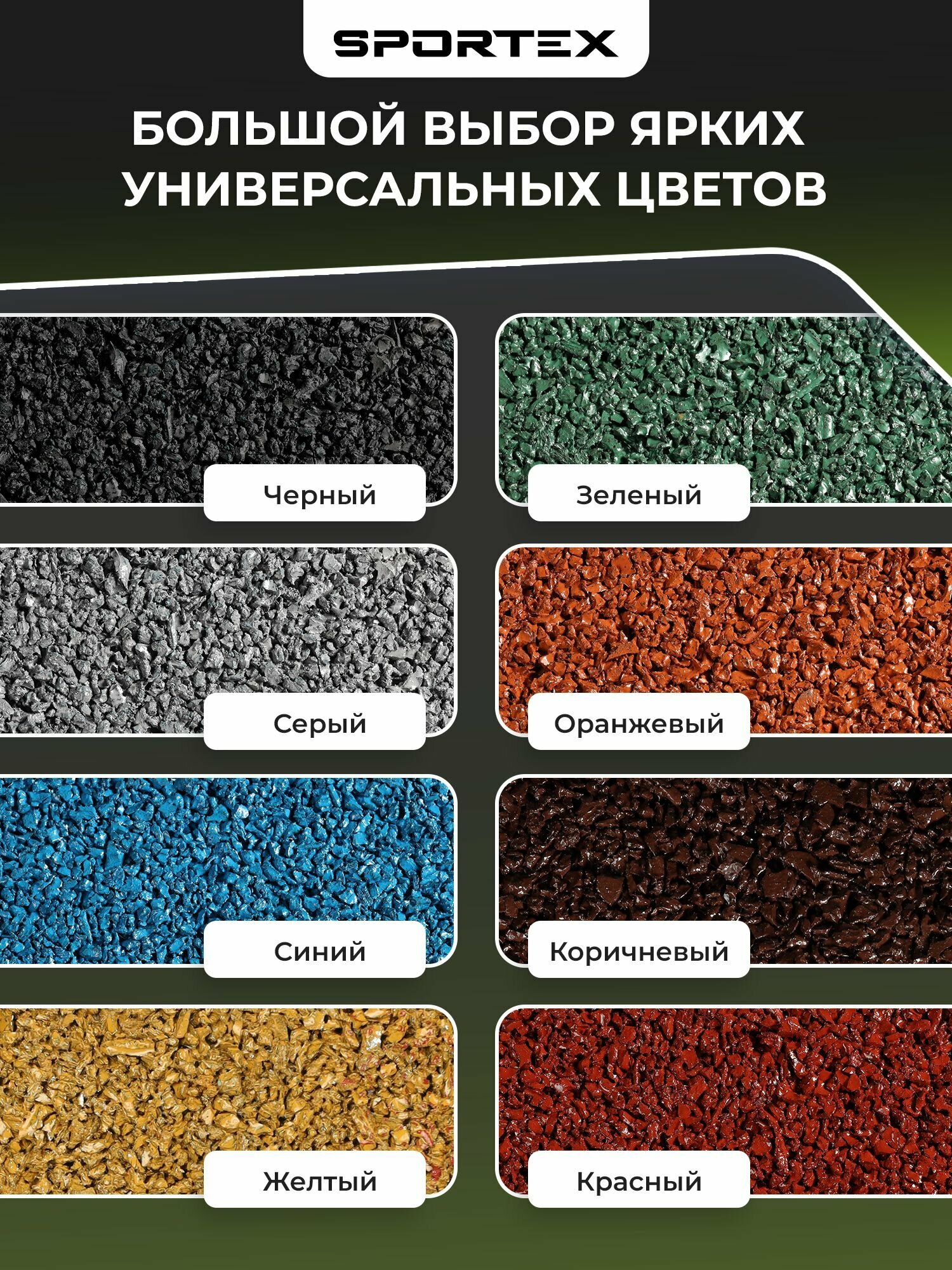 SPORTEX — это готовое решение для самостоятельной укладки наливного резинового покрытия из резиновой крошки. Без опыта, без дорогостоящего инструмента и без привлечения специалистов — всё просто, быстро и удобно. Более 90 % покупателей укладывают покрытие за 1 день! Выберите нужный объём: в продаже готовые наборы на площадь от 1 до 3 м². Нужно больше? Все компоненты — крошка, клей, пигмент — можно докупить отдельно для любой площади.