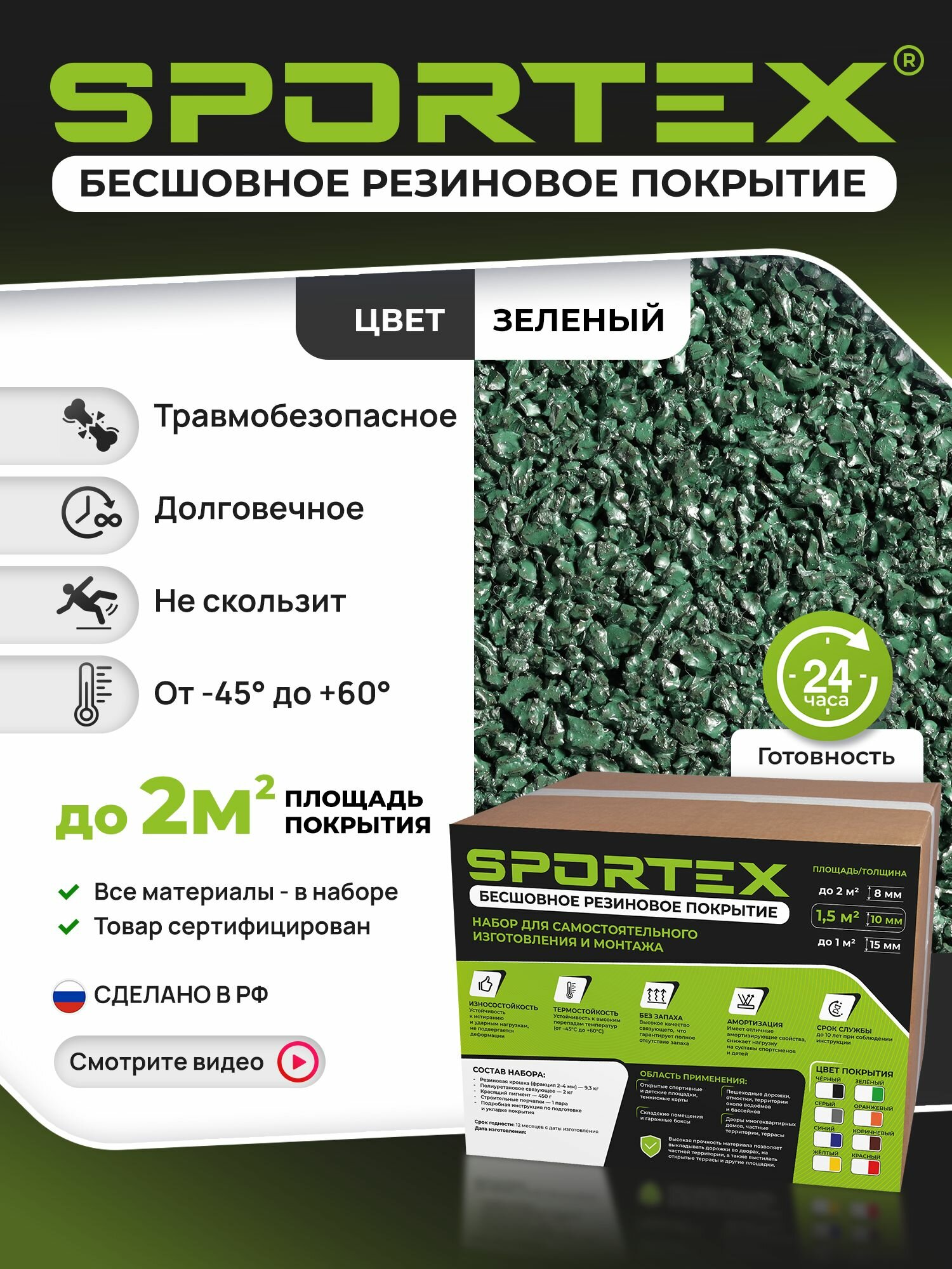 SPORTEX — это готовое решение для самостоятельной укладки наливного резинового покрытия из резиновой крошки. Без опыта, без дорогостоящего инструмента и без привлечения специалистов — всё просто, быстро и удобно. Более 90 % покупателей укладывают покрытие за 1 день! Выберите нужный объём: в продаже готовые наборы на площадь от 1 до 3 м². Нужно больше? Все компоненты — крошка, клей, пигмент — можно докупить отдельно для любой площади.