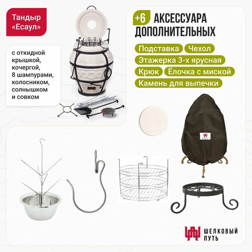 Получив набор "Стандарт": Тандыр "Есаул" с откидной крышкой + аксессуары, вдоволь налюбовавшись красотой тандыра и подготовив его к первому использованию, вам останется только выбрать продукты и начать помещать их в камеру разогретой печи, засекая время. Следить за процессом не придется – тандыр все сделает сам. Обретя опыт на простейших блюдах, в дальнейшем вы сможете реализовывать любые кулинарные фантазии, используя готовые рецепты и придумывая свои. Тандыр «Есаул» – азиатская печь, в которую многие влюбляются с первого взгляда. Выполненный в форме древней амфоры, этот керамический шедевр безупречно красив и функционален одновременно. Получив вместе с ним основной набор аксессуаров, вы сможете сразу планировать роскошное меню. Важно, что приспособления идеально подходят к этой печи, и вам не надо выполнять расчеты для дополнительной комплектации. К тому же, набор обходится намного дешевле множества разрозненных покупок с доставкой. Особенности и преимущества Тандыр «Есаул», изготовленный из высококачественной шамотной глины и упроченный металлическим каркасом с кольцами для удобной переноски, – это азиатская печь средней категории. Ее можно установить на загородном участке, а также брать с собой на природу со всеми базовыми приспособлениями. Для этой печи подойдут любые дрова, а также покупные топливные брикеты и угли для розжига. «Есаул» со стандартным набором аксессуаров подойдет тем, кто ищет «золотую середину» в мире восточных дровяных печей. Это касается всех ключевых параметров: веса, высоты, внутреннего размера, цены. Прекрасный вариант для большой семьи или дружной компании из 10-12 человек, хотя при умелом использовании печи можно наготовить еды и на большее количество людей. Основная крышка «Есаул» оснащена специальным откидным механизмом, что существенно упрощает использование тандыра. Ее не придется поднимать и переносить на дополнительную подставку. Это значит, что даже хрупкая женщина или подросток смогут готовить в нем. Если надо обеспечить тягу или просто заглянуть внутрь со сбережением тепла, можно просто снять верхний керамический колпачок. Удобству использования печи, увеличению срока использования и большему сохранению тепла служит специальная подставка, которая, к тому же, отлично удерживает амфору на любой поверхности и стилистически сочетается с основными ее элементами. Специальная «елочка», на которую можно нанизать мясо, овощи, фрукты и прочие вкусности, – одно из самых востребованных приспособлений для тандыров. Вы имеете возможность получить ее в комплекте с «Есаулом», как и трехъярусную этажерку, на которой можно уложить полуфабрикаты, грибы, стейки и так далее. Камни для выпечки, предлагаемые в наборе, станут находкой для тех, кто обожает восточные лепешки, интересную пиццу и настоящий, «правильный лаваш». Изготовленные из чистой керамики, они прекрасно поместятся на этажерке. Те, кто любит запекать целую баранью ногу, птицу или свиную рульку, непременно оценят удобство специального крюка, который тоже идет в комплекте. Вы просто наденете на него свою «добычу», а затем извлечете готовую вкусноту. Светло-бежевая керамика с узорным барельефом отлично сочетается с коваными элементами, а сама форма тандыра ассоциируется с миром древних амфор и восточной мифологии. Конечно, сохр