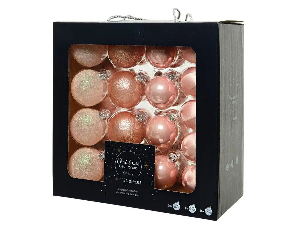 Купить Набор стеклянных шаров «Розовый шарм», 7 /6 /5 см, глянцевые, матовые, антик, глиттер, 34 шт, Kaemingk с доставкой по всей России.