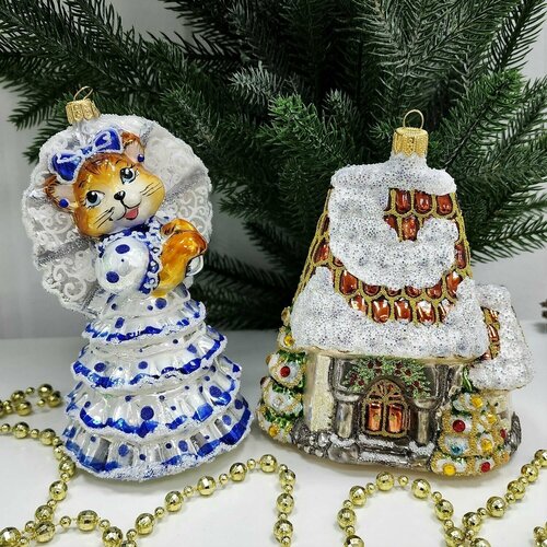 Irena-Co Набор елочных игрушек, стекло Дом — 13х12,5х8,5, Кошка — 15х9х8,5