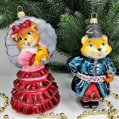 Набор стеклянных ёлочных игрушек Irena-Co Кошка с зонтиком — 15,5х8х10, Котофей — 13х7,5х6