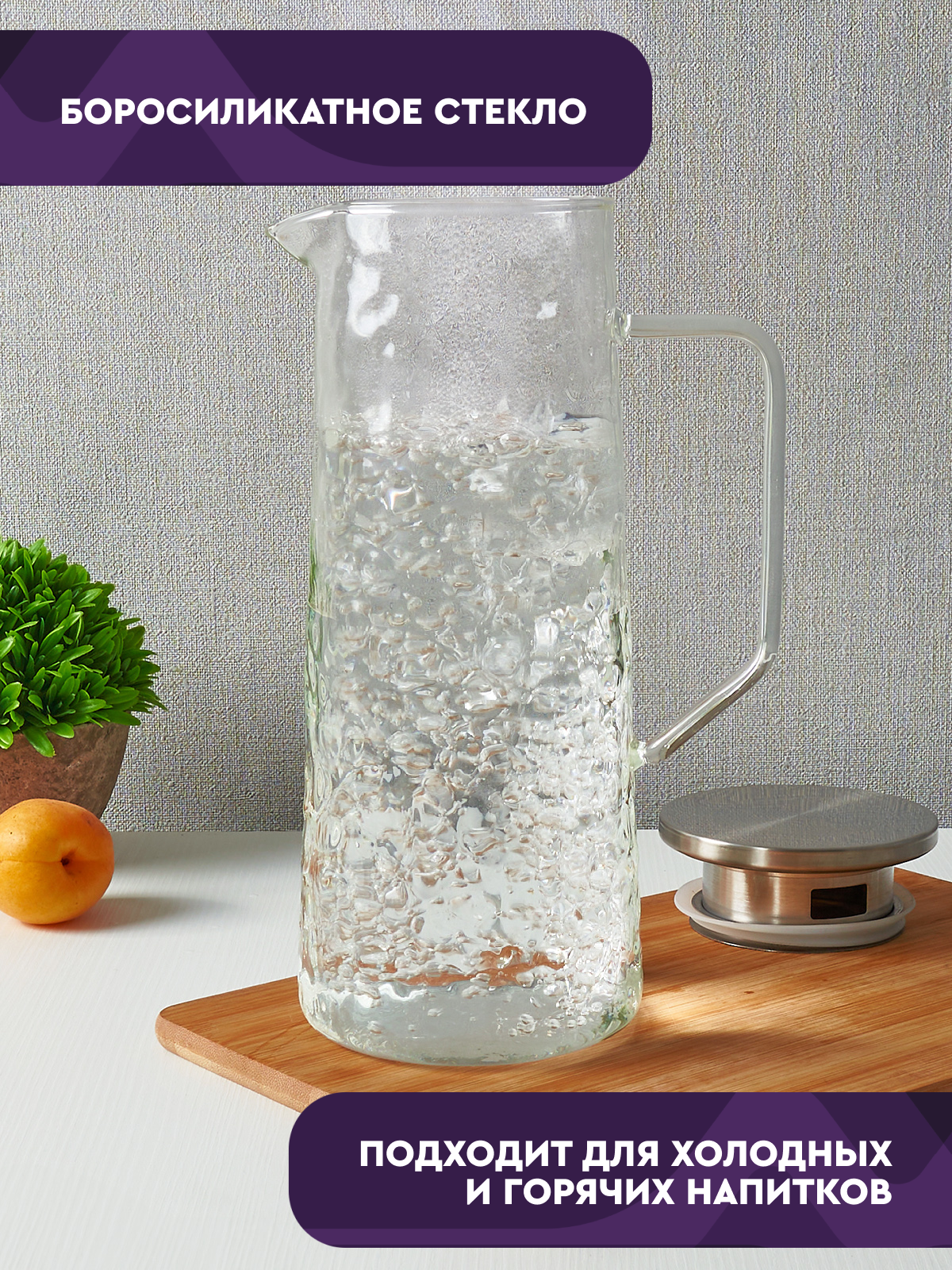 Стеклянный кувшин выполнен из жаропрочного боросиликатного стекла, устойчив к перепадам температур (-20°С ~400°С, тепловой удар 120°С), царапинам и помутнениям. Графин не впитывает запахи и сохраняет неизменным вкус и аромат напитков. Крышка кувшина выполнена из полипропилена, имеет силиконовый уплотнитель и фильтр из нержавеющей стали, который надежно блокирует ягоды, фрукты, лед и другие ингредиенты, помещённые в кувшин.