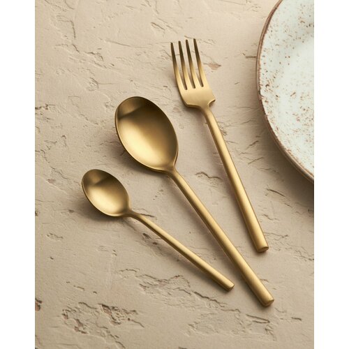 Набор столовых приборов на 4 персоны из нержавеющей стали, которая производится по самым высоким стандартам качества. Приборы устойчивы к коррозии, ржавчине и окислению. Цвет золотой матовый. В набор входит: