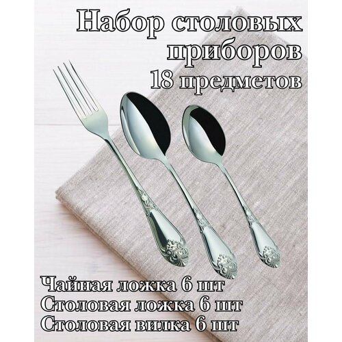 Набор столовых принадлежностей на 6 персон предназначен для сервировки стола. В комплект входит 18 предметов из высококачественной нержавеющей стали. Не подвержены коррозии, окислению. Выполнены в серебряном цвете. Практичный и элегантный набор ложек и вилок идеально подходит для оформления праздничного стола и ресторанных банкетов, а так же для повседневного использования. Кухонный набор придется любой хозяйке по вкусу и станет прекрасным на любое торжество. Для привлекательного внешнего вида не рекомендуется протирать посуду твердыми предметами, металлическими губками. При бережной эксплуатации набор столовых принадлежностей прослужит вам очень долго. Приобретайте наши столовые приборы и наслаждайтесь их эстетикой каждый день! В набор входит: